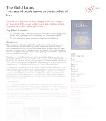A.D. Dauphinais started her “out if this world” life journey during a long solo pilgrimage in India at the age of eighteen. For the past twenty-five years, she has been immersed in ancient knowledge, fascinated by Buddhist, Vedic and Sanskrit literatures. The Gold Lotus is her first fantasy book, part of a multi-world drama series. She is the founder of two non-profits, ancient temple dance teacher, director of Devi Communications Music, founder of TerraVoyage LLC and the managing director of Big Island Farms. She spends most of her free time planting trees and saving ancient seeds at her organic permaculture bases farms.